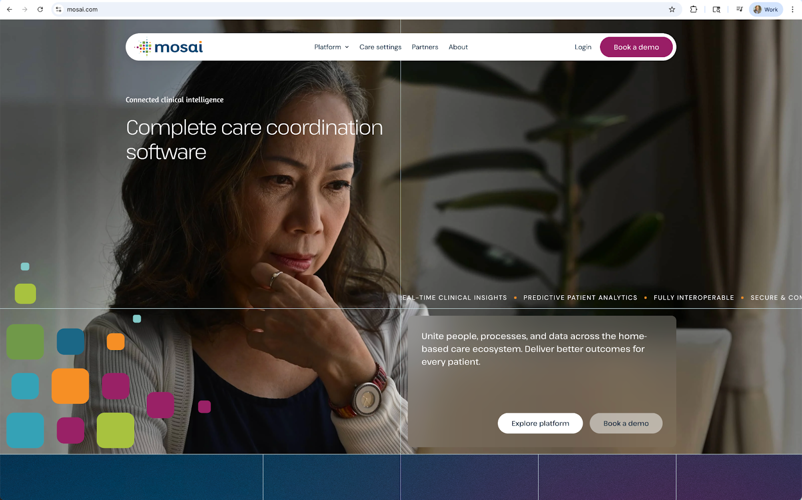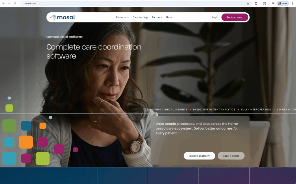 Guided by the value proposition of bringing fragmented healthcare continuum players together to paint a fuller, clearer picture for providers, Mosai’s identity and positioning were inspired by the idea of a mosaic, where fragments combine to reveal a larger, radiant story. Intelligent care is a work of art, and that’s what Mosai makes possible. Neither legacy name, nor a combination of them, had the potential to tell that story.